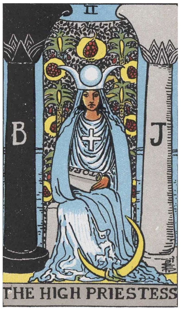 As previously mentioned, the High Priestess is seated between the two pillars with the letters B and J, which stand for Boaz and Jachin, the left and right pillars on the Tree of Life, representing the cognitive and affective aspects of our being. The Tarot Card thus depicts the path leading to the unification of bodhicitta and the wisdom realizing emptiness.