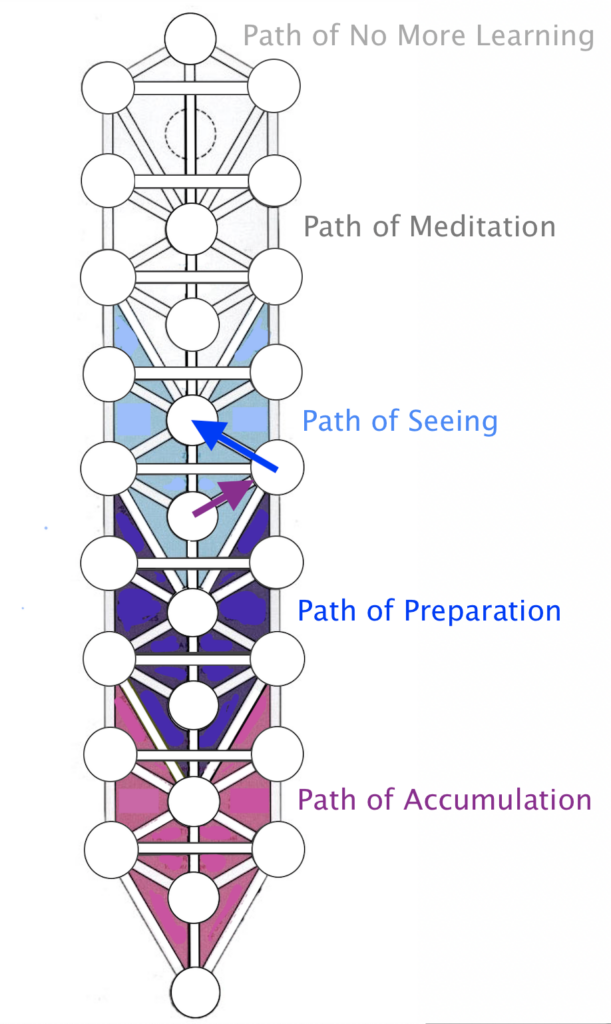 As mentioned above, this direct and spontaneous realization of emptiness is the path that needs to be developed to enter into the stage of the spiritual path known, in Vajrayana Buddhism, as the Path of Seeing. This realization is gained when the aspirant takes the path from Malkuth to Yesod in Briah, which corresponds to the path from Tiphareth to the revealed Daath in Yetzirah. The mystical experience represented by the revealed Daath (which is now Yesod in Briah) provides the direct experience of emptiness, and is the reason why it is called the Path of Seeing. This is the stage where the practitioner sees the emptiness of all phenomena directly, without the need to analyze and deduce that it is so.